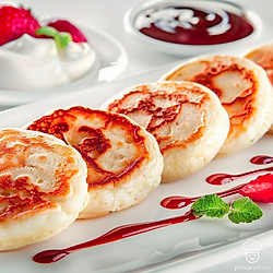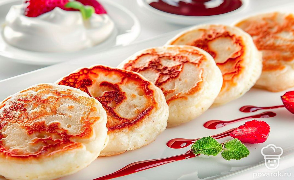 Выложите сырники на тарелку и украсьте ягодами, сметаной, сгущенным молоком.