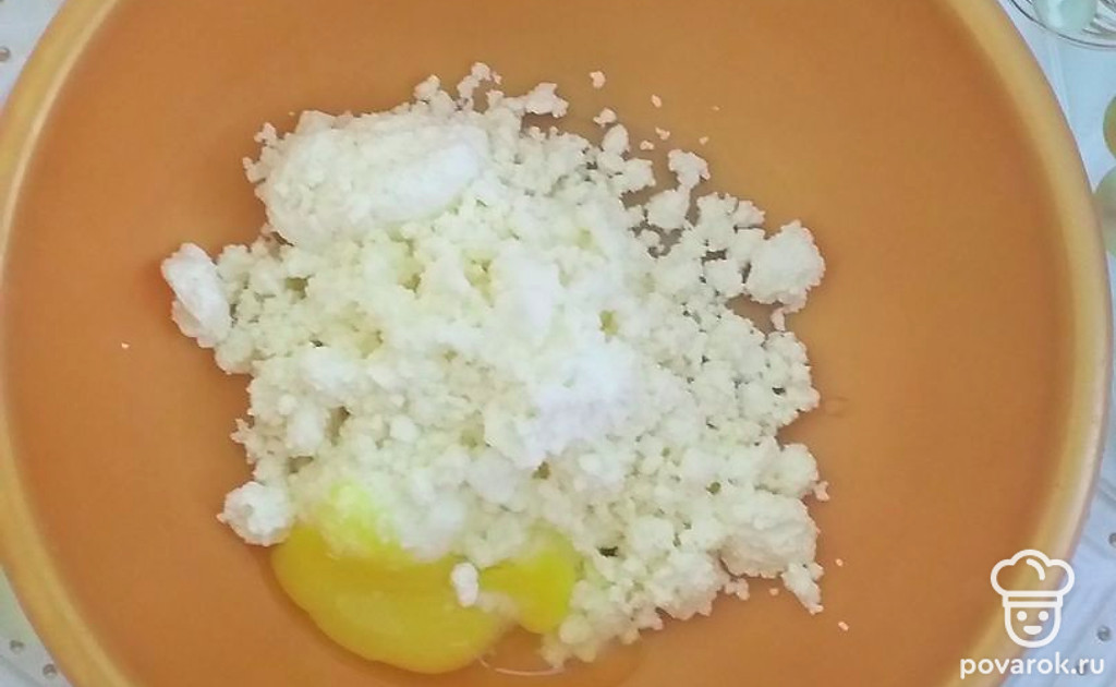 Вбейте яйца в творог, тщательно перемешайте, добавьте сахар и муку.