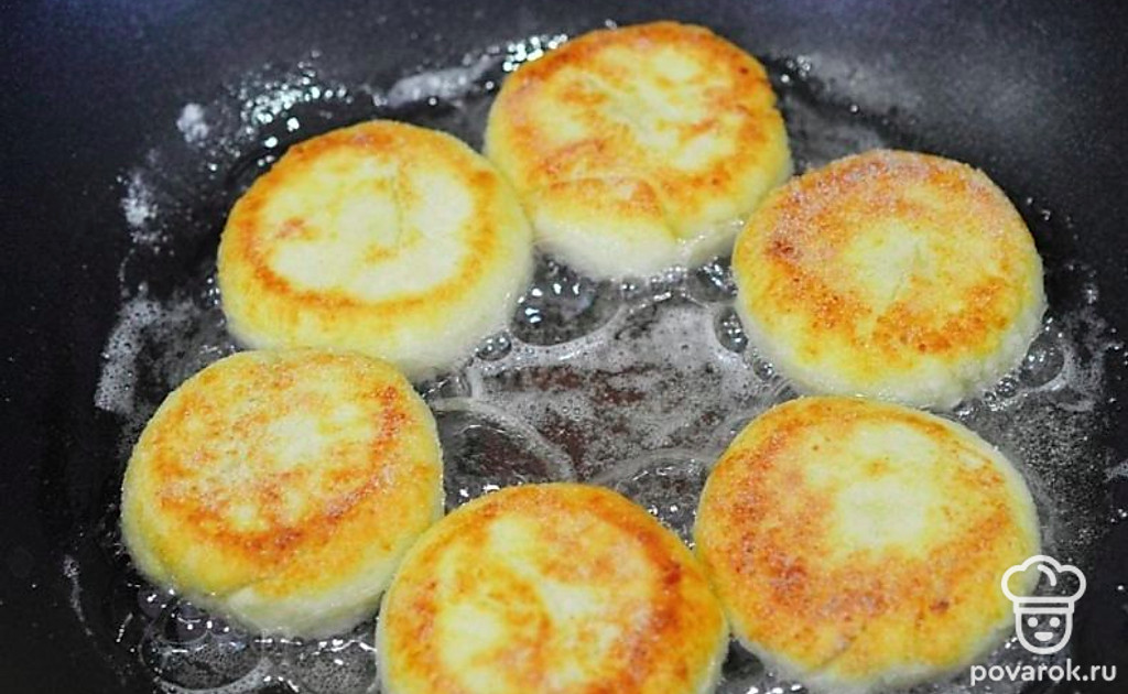 На раскаленную сковороду налейте масло и обжарьте сырники с двух сторон до золотистого цвета.