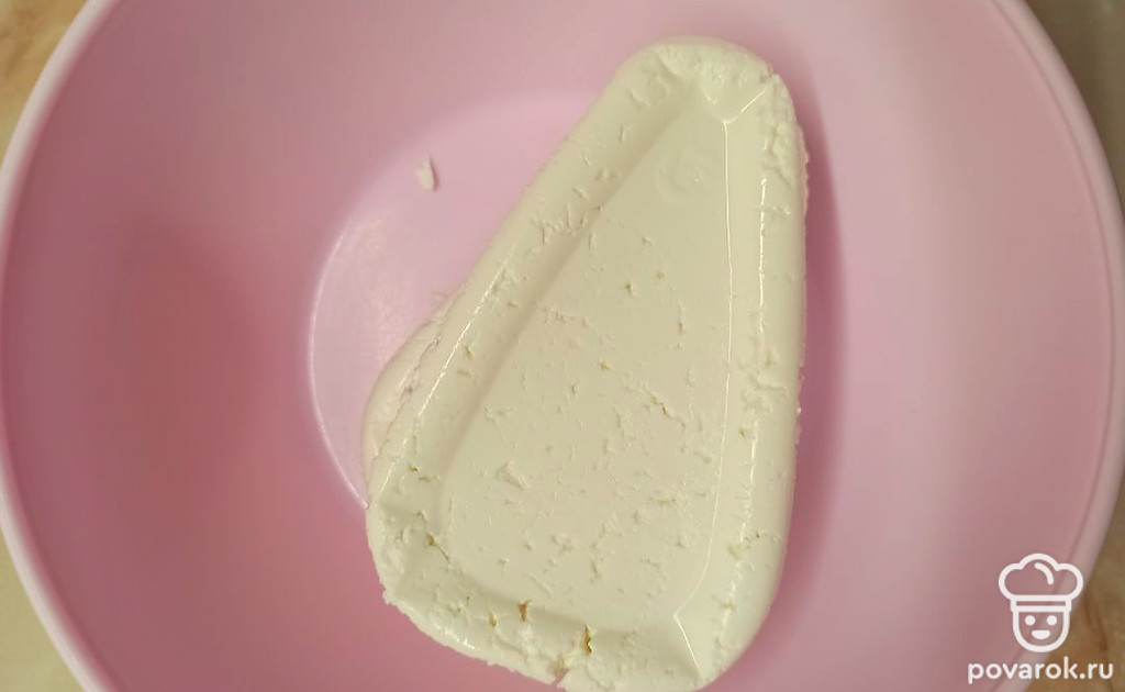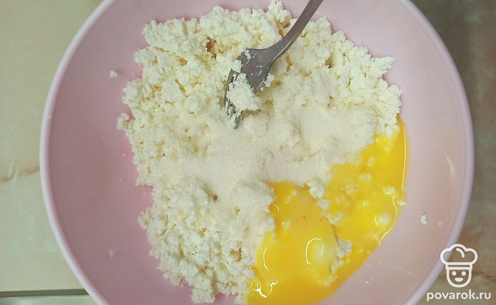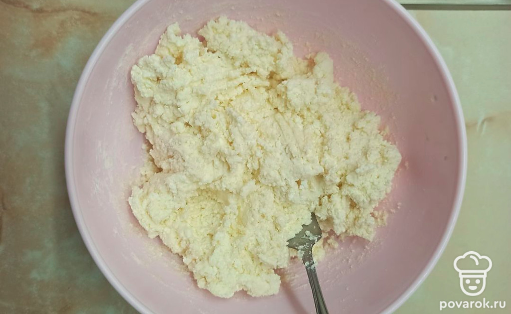 Творог выложите в посуду, помните вилкой.