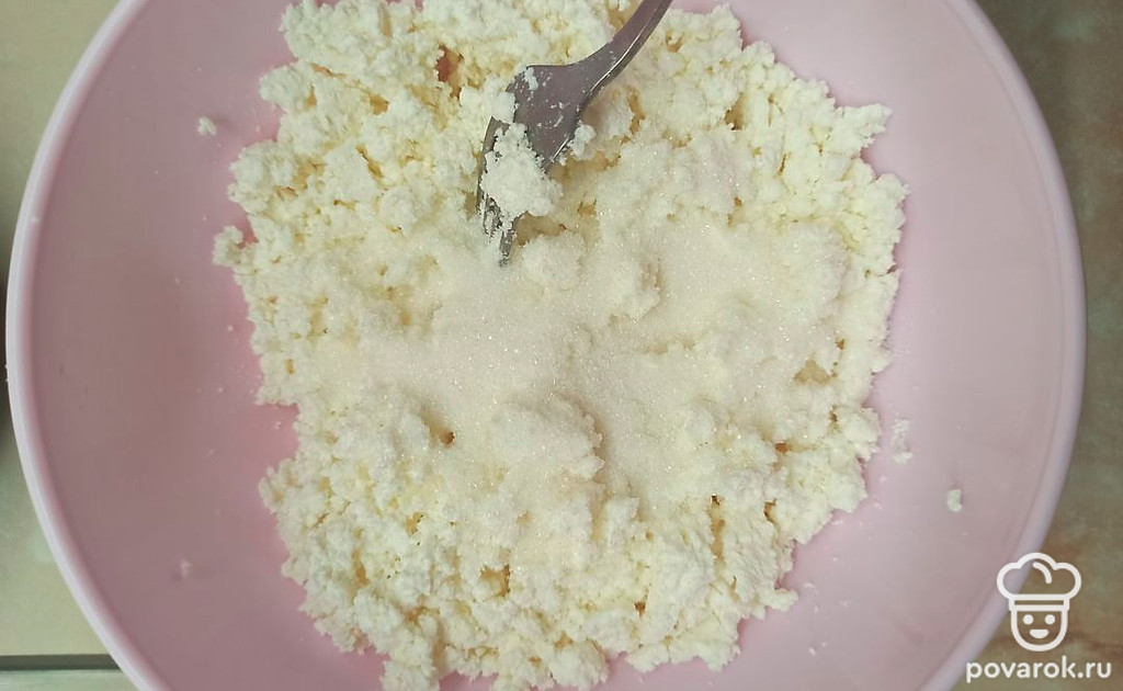 К творогу добавьте сахар.