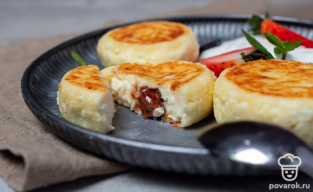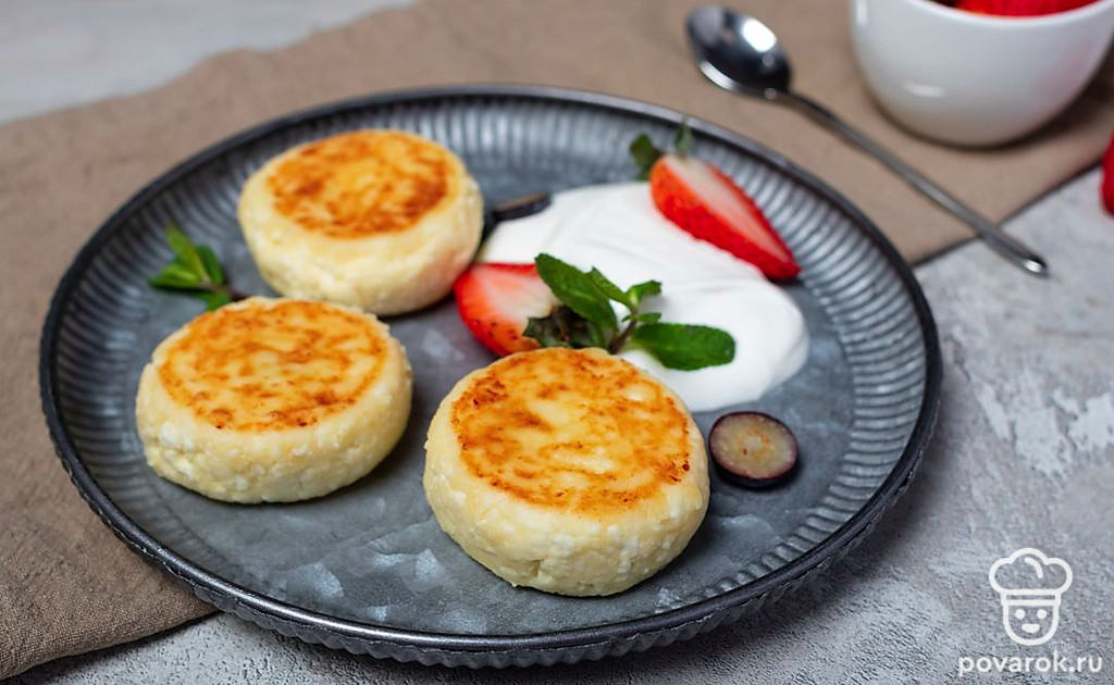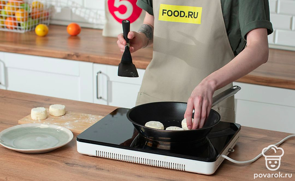 Разогрейте на сковороде небольшое количество масла и выложите сырники. Обжарьте по 3 минуты с каждой стороны на низком нагреве до золотистой корочки.