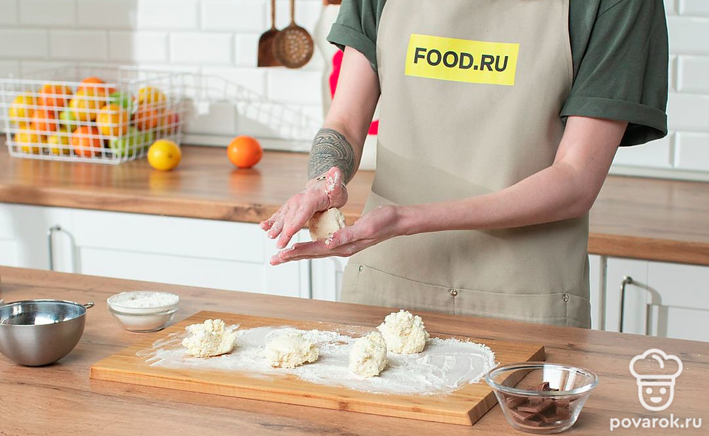 Разделите массу на 4-5 равных частей. Нарежьте дольки шоколада на небольшие кусочки и положите по одному в центр каждой части теста. Скатайте каждую часть в шарик, присыпав руки и поверхность для лепки мукой. Сформируйте из каждого шарика шайбочку.