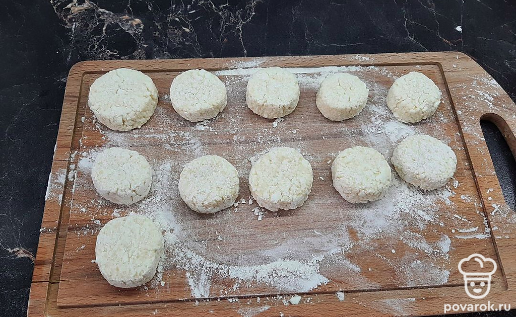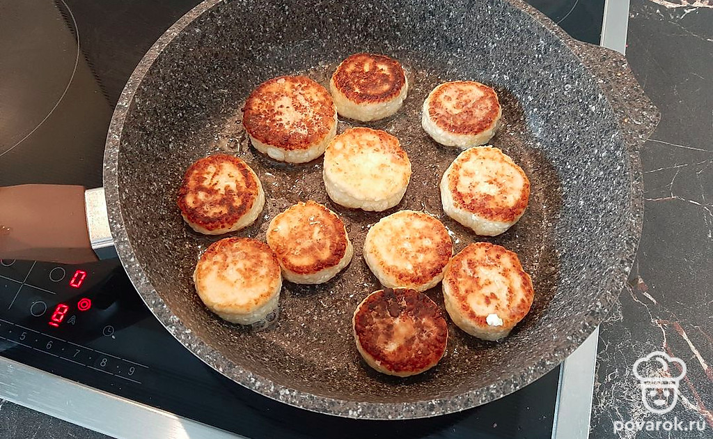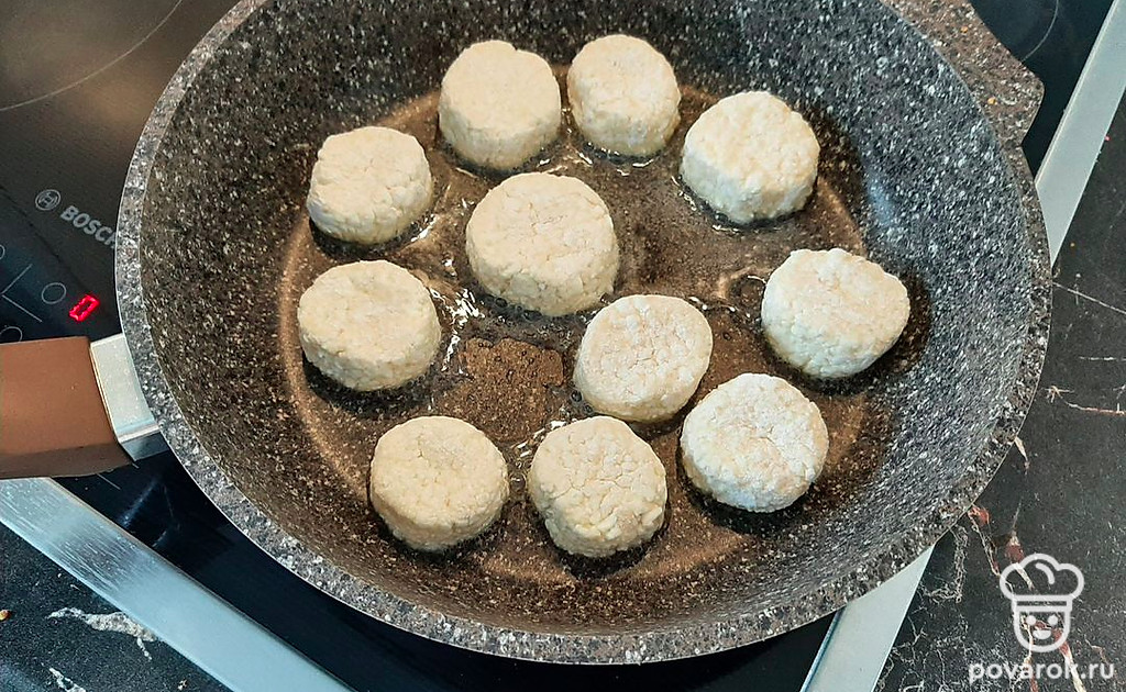 Выложите сырники и обжаривайте 2-3 минуты до золотистой корочки.