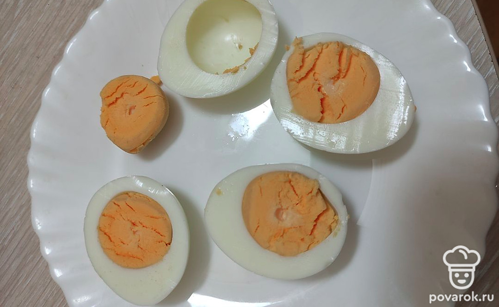 Яйца отварите вкрутую, остудите и разрежьте пополам.