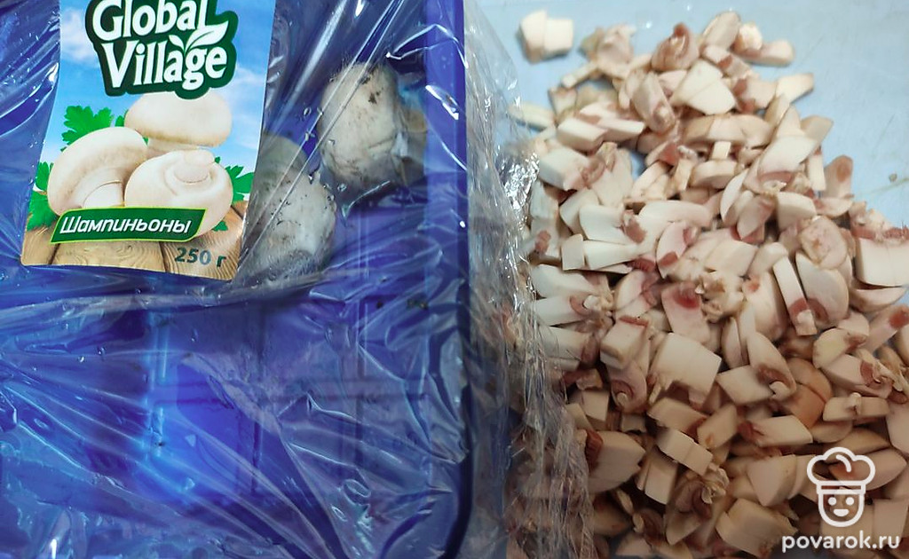 Чистые шампиньоны мелко нарежьте и обжарьте до готовности.