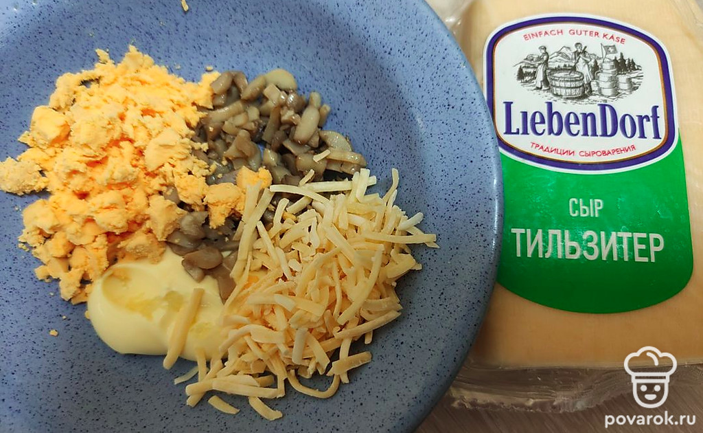 Сыр натрите на терке, желтки раскрошите. Смешайте желтки, сыр, грибы, майонез и поместите начинку в белки.