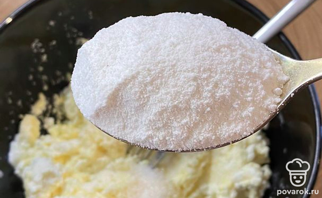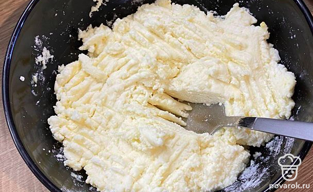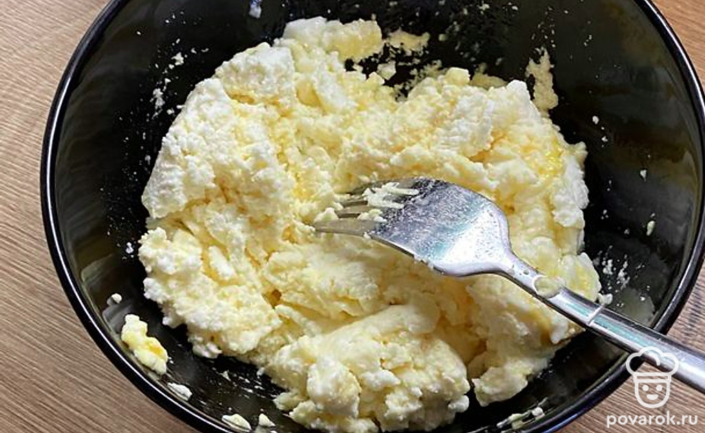 Добавьте в творог яйцо и перемешайте вилкой. Добавьте сахар.