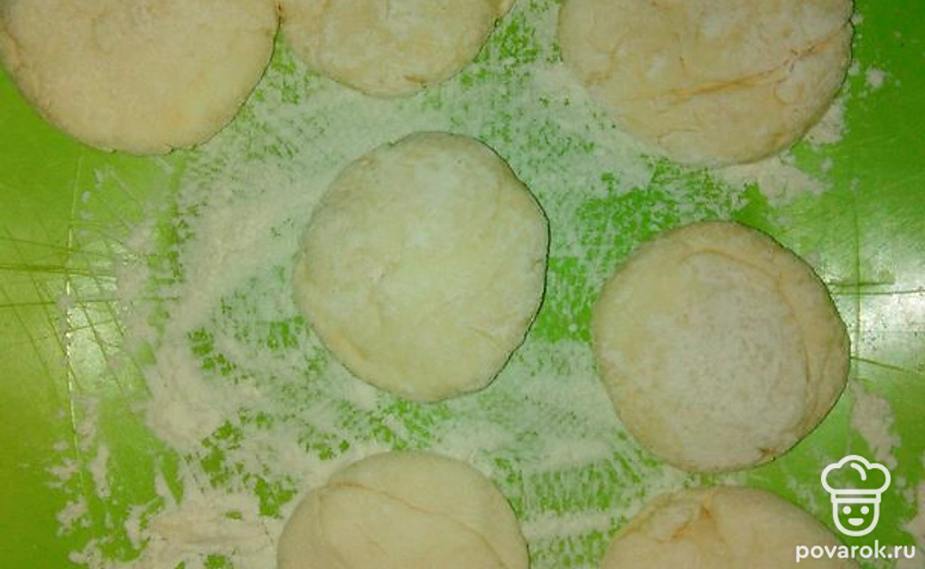 Влажными руками возьмите столовую ложку смеси и сформируйте шарик. Придайте ему плоскую форму, обваляйте в муке с двух сторон. Выложите на доску или тарелку.