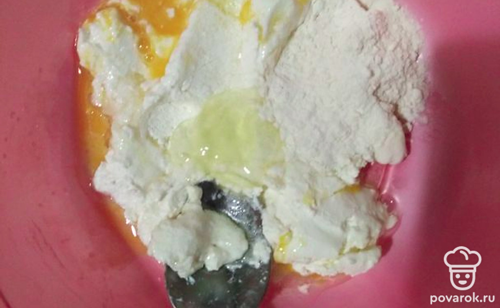 Возьмите творог, сахар, яйцо и 2 столовые ложки муки и тщательно перемешайте в миске. Масса должна получиться не липкой и не влажной, она должна держать форму.