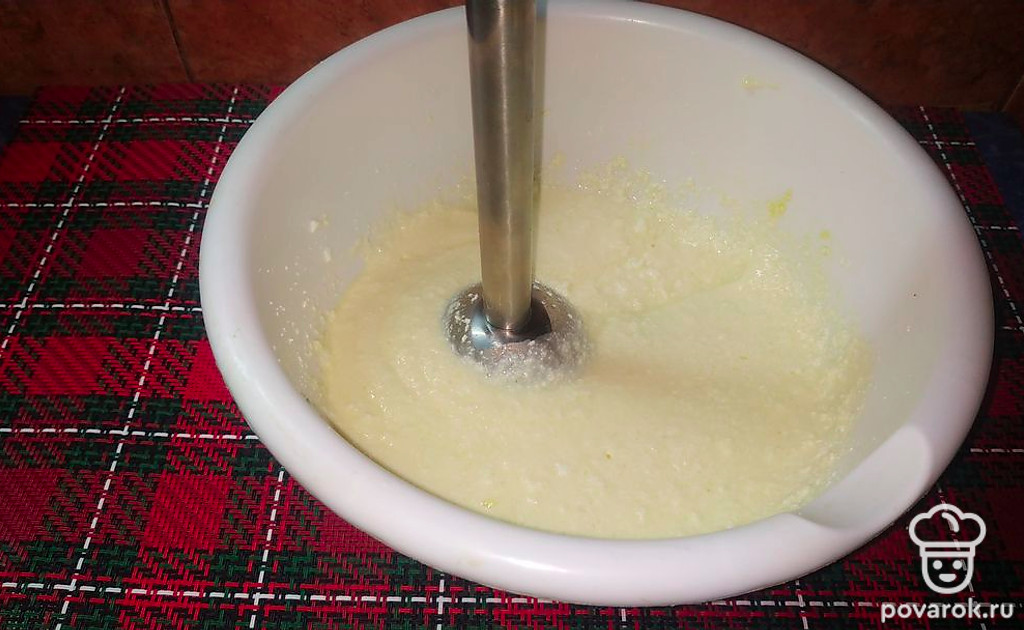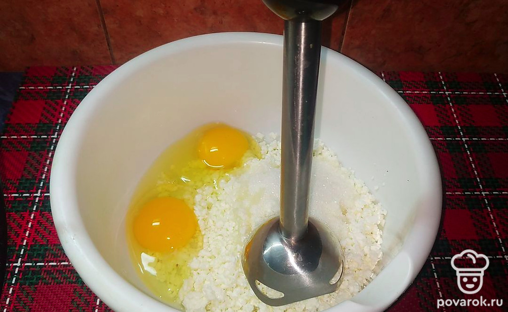 Творог с сахаром измельчить блендером до однородной массы.