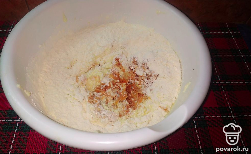 Добавить яйца, разрыхлитель и просеянную муку.