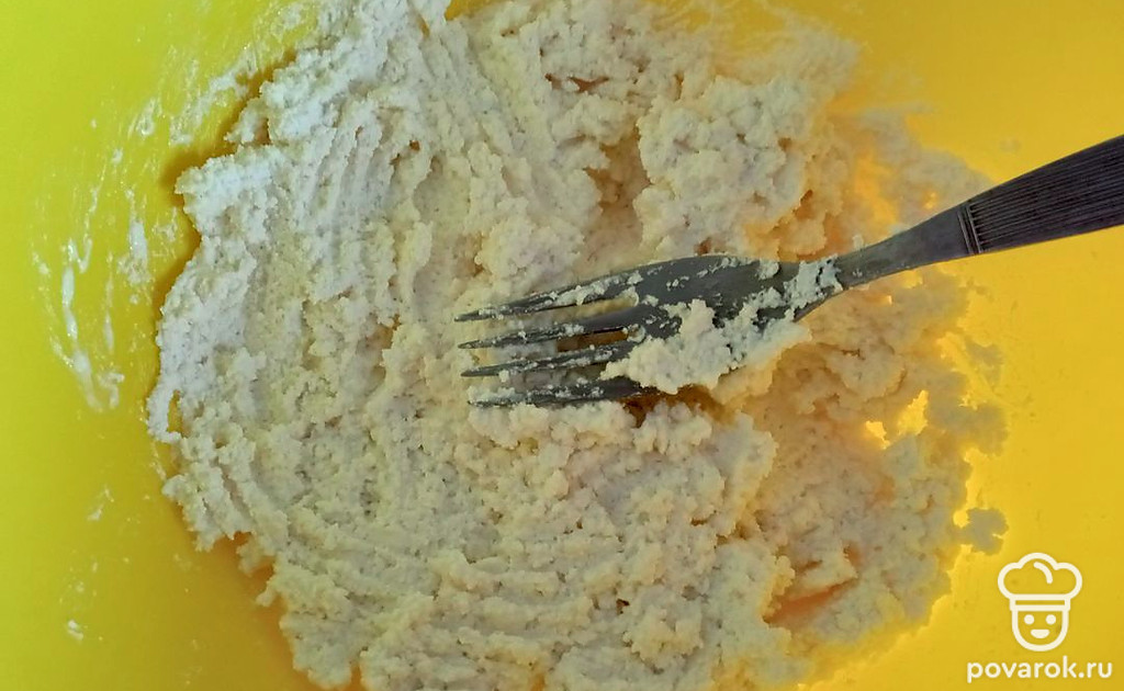 Добавьте творог, тщательно разомните вилкой и перемешайте с яйцом.
