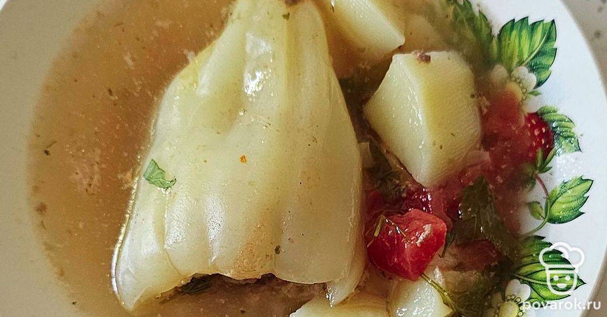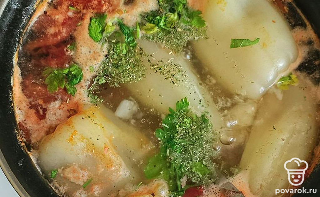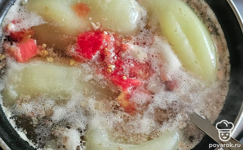 Добавьте к перцу лук и нарезанный помидор. Варите 30 минут.