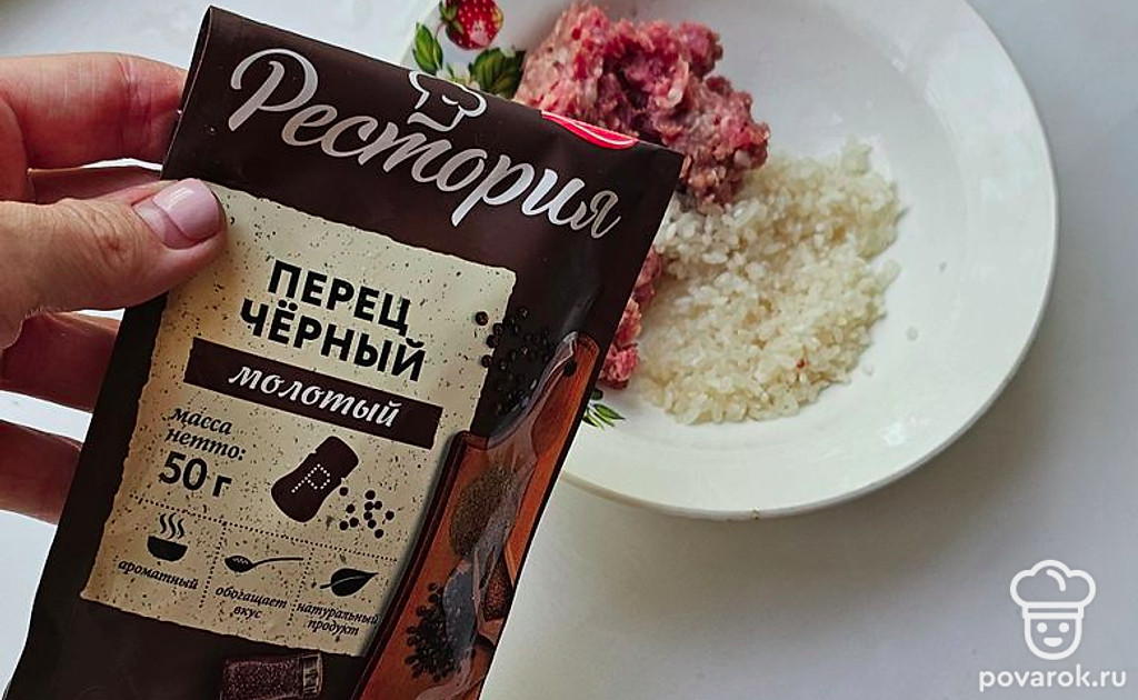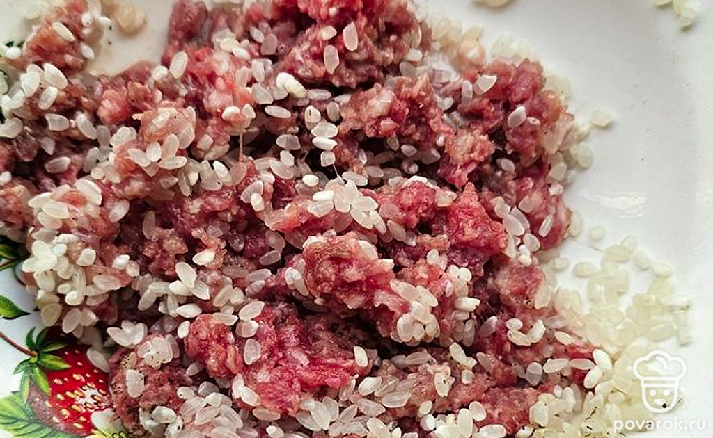 В фарш добавьте соль, перец, рис. Хорошо перемешайте. Почистите перец.