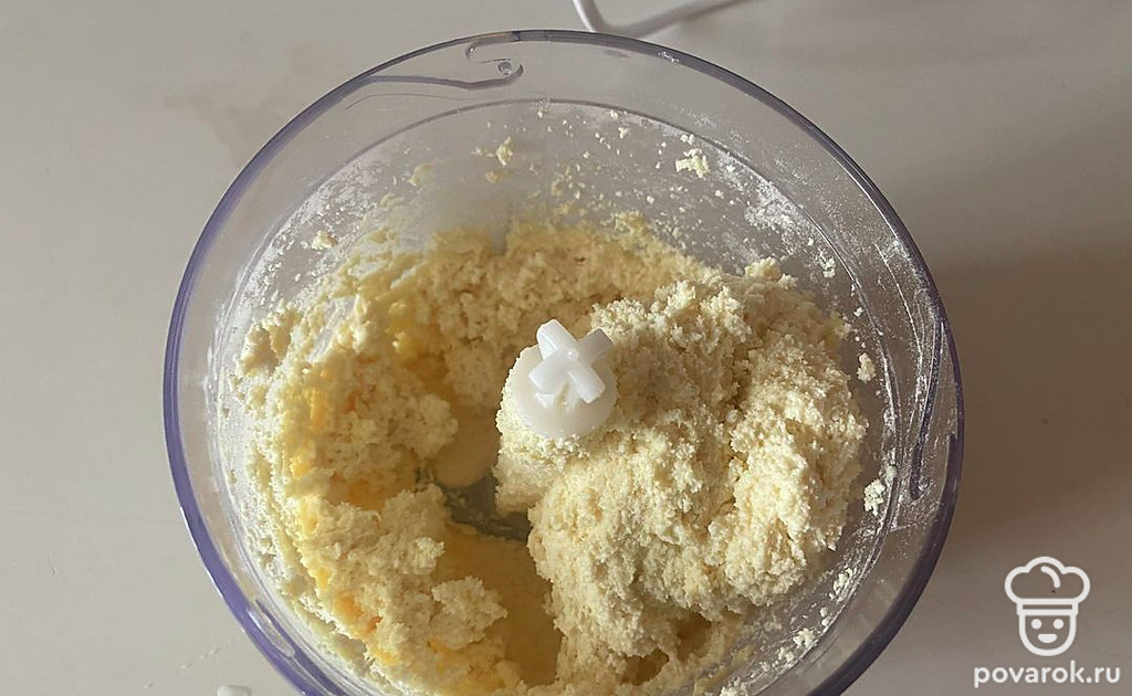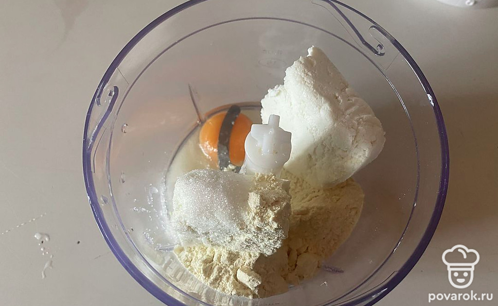 В чашу блендера поместите творог, яйцо, сахар и муку.