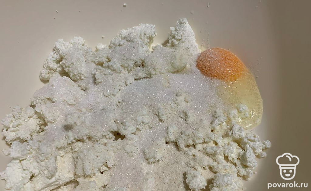 Творог советую брать рассыпчатый, а не в брикетах. Если творог слишком влажный, отожмите его через марлю, добавьте яйцо, сахар и манку. Перемешайте и оставьте на 15 минут, чтобы манка набухла. Не добавляйте слишком много сахара, он разжижает массу.
