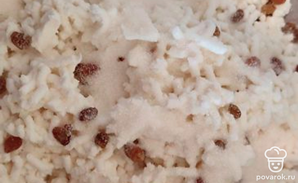 Соединить с сахаром, ванилином, разрыхлителем и изюмом.