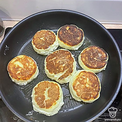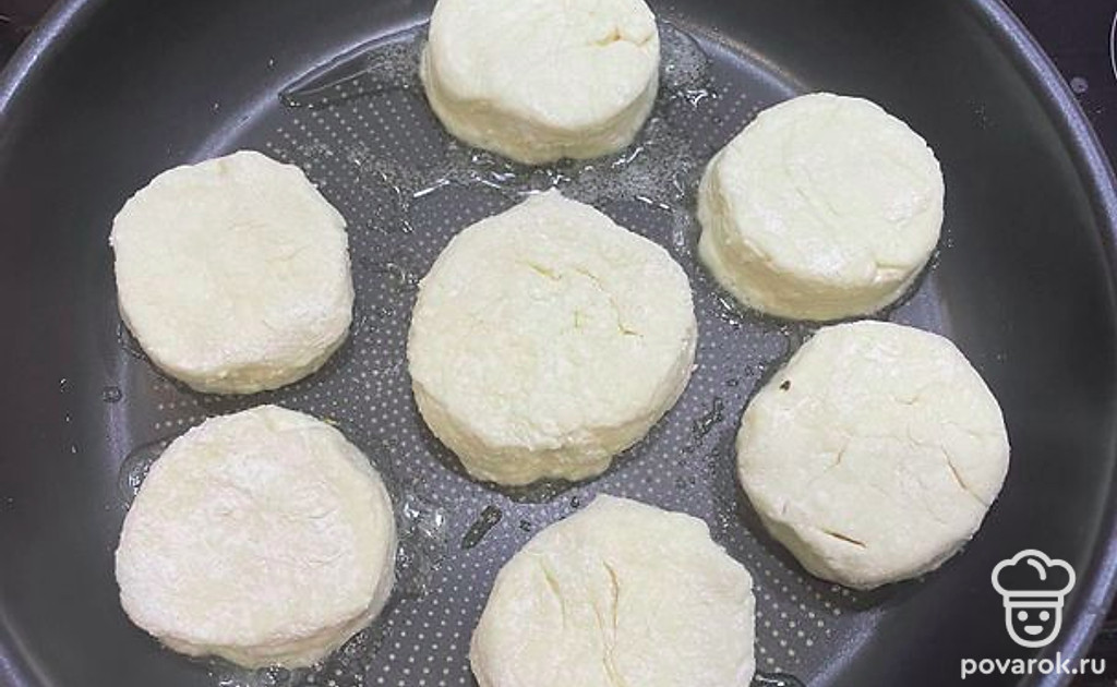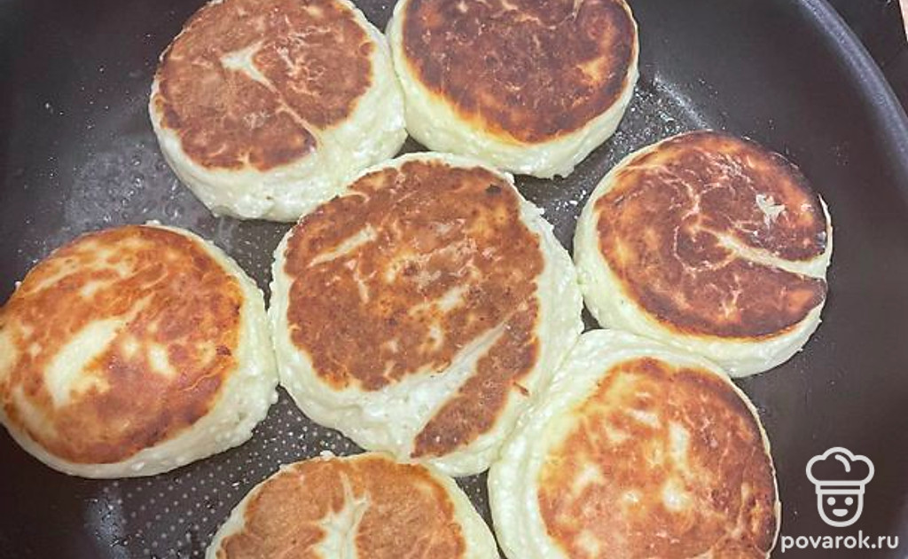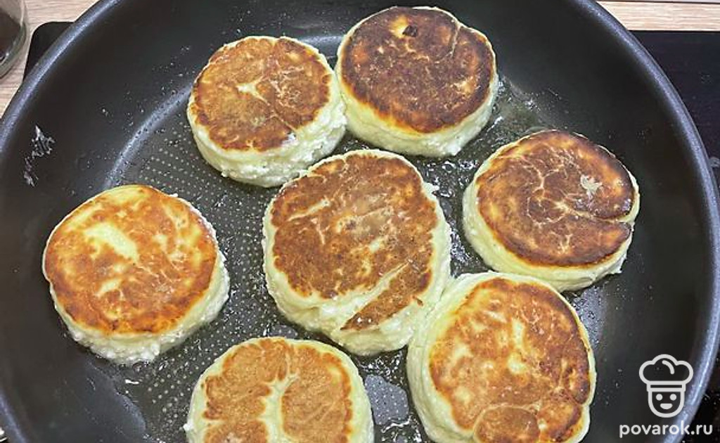 Выложить сырники, обжарить до золотистого цвета с каждой стороны под крышкой на медленном огне.