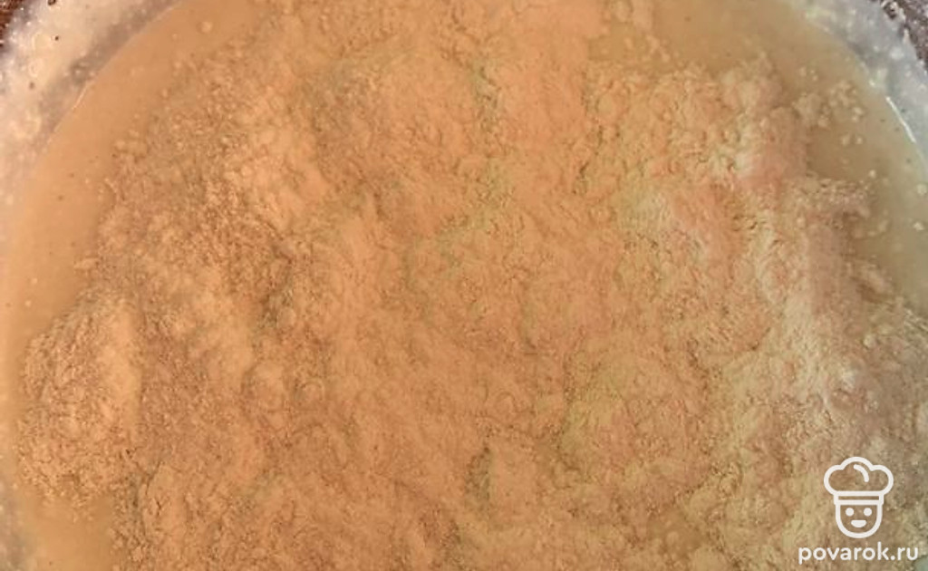 После добавляем муку и перемешиваем, что бы не было комочков.