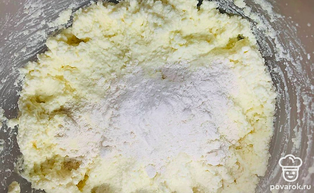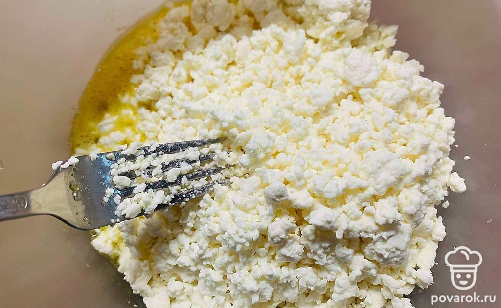 Положите творог, тщательно разбейте все комочки вилкой.