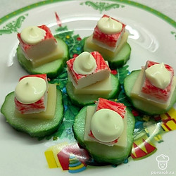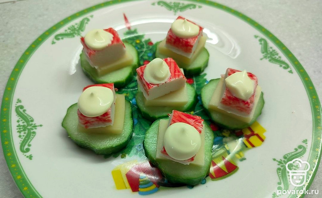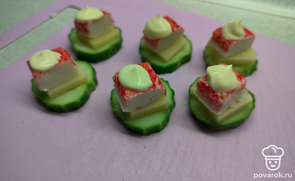 На кружочек огурца выложите сыр. Далее положите кусочек крабовый палочки. Сверху выдавите немного майонеза.