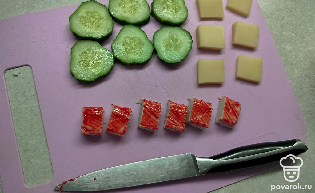 Нарежьте все составляющие на кусочки толщиной 0,5-1 сантиметр: огурцы — кружочками, сыр — квадратиками 2 на 2 сантиметра, крабовые палочки — кусочками по 2 сантиметра.