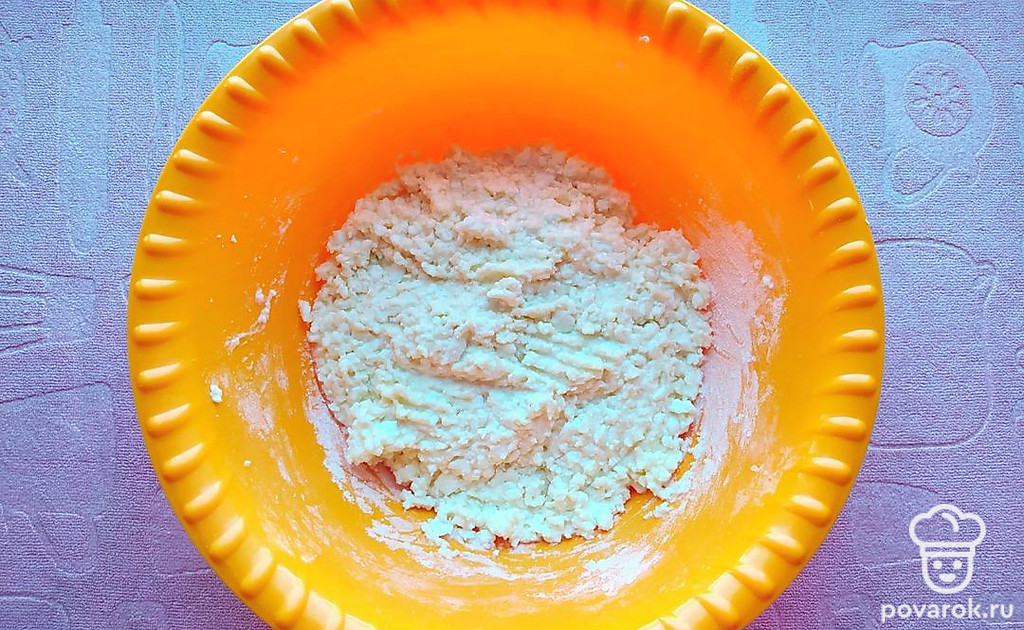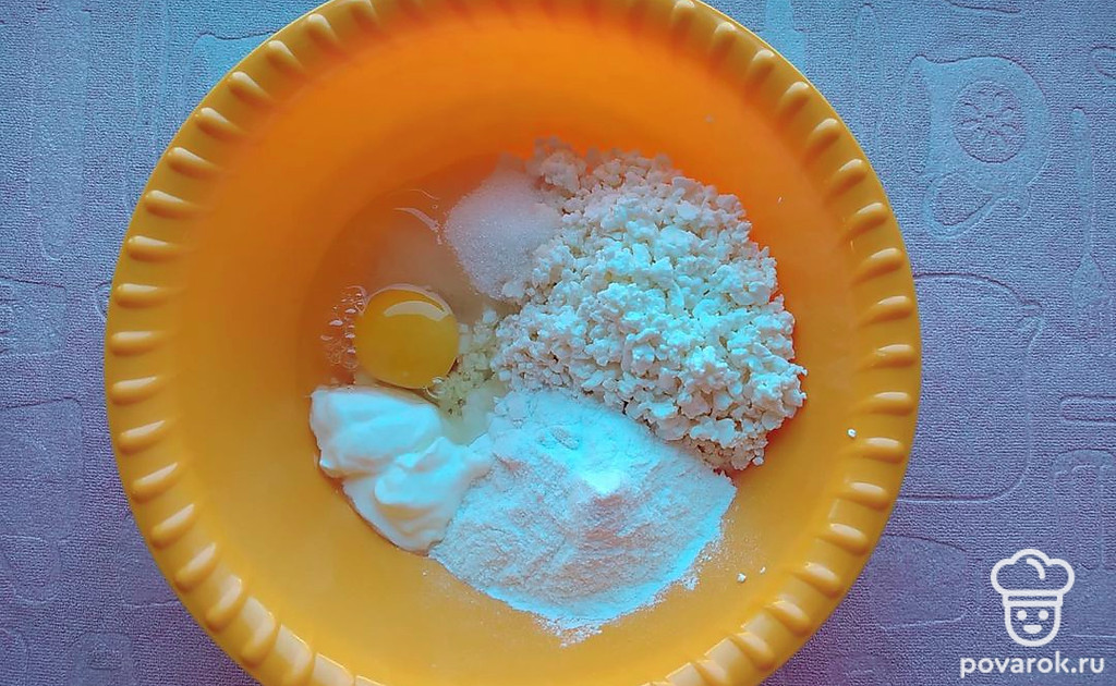 Соединить в глубокой миске творог, муку, сметану, яйцо, добавить сахар и соль.