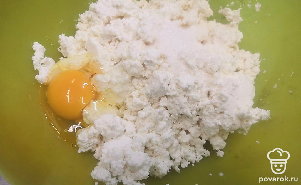Творог выложите в ёмкость и помните его вилкой. Добавьте соль, сахар, яйца и манную крупу. Все перемешайте и дайте постоять 10-15 минут (чтобы манка маленько набухла).