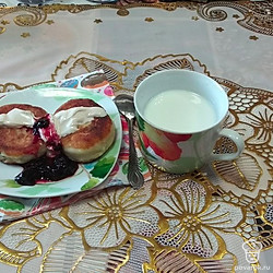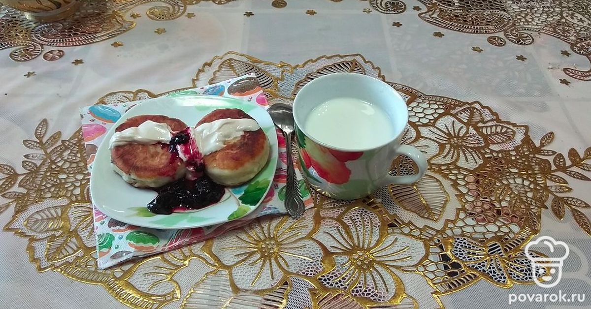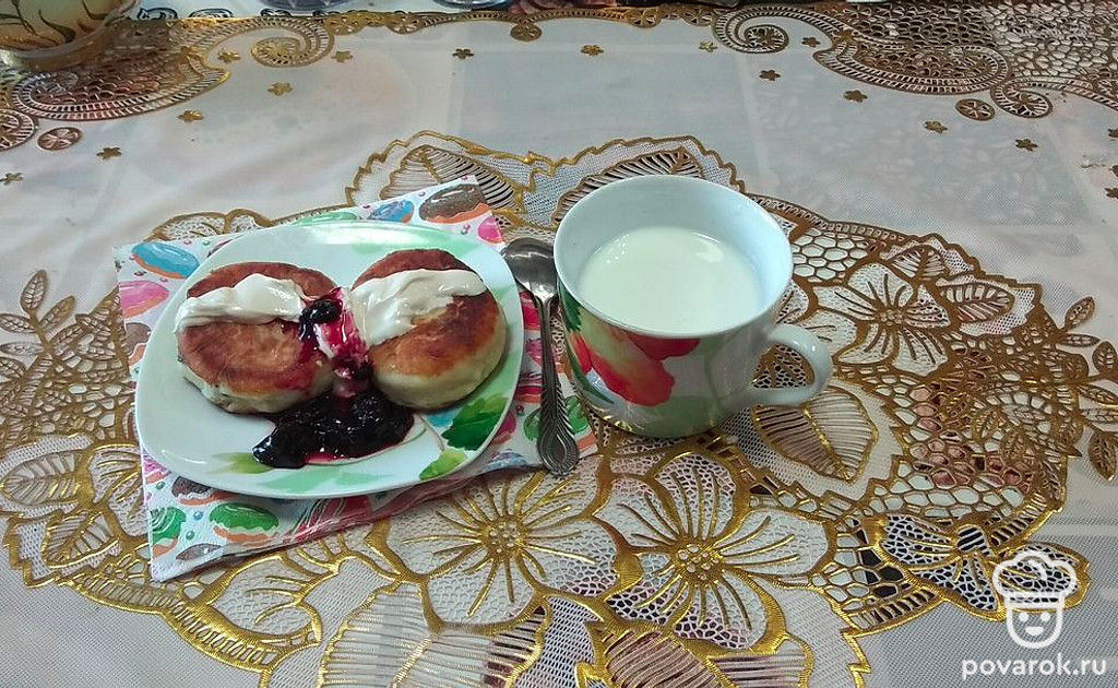 Подаём порционно, со сметаной и ягодным вареньем и чашкой молока. Приятного аппетита.