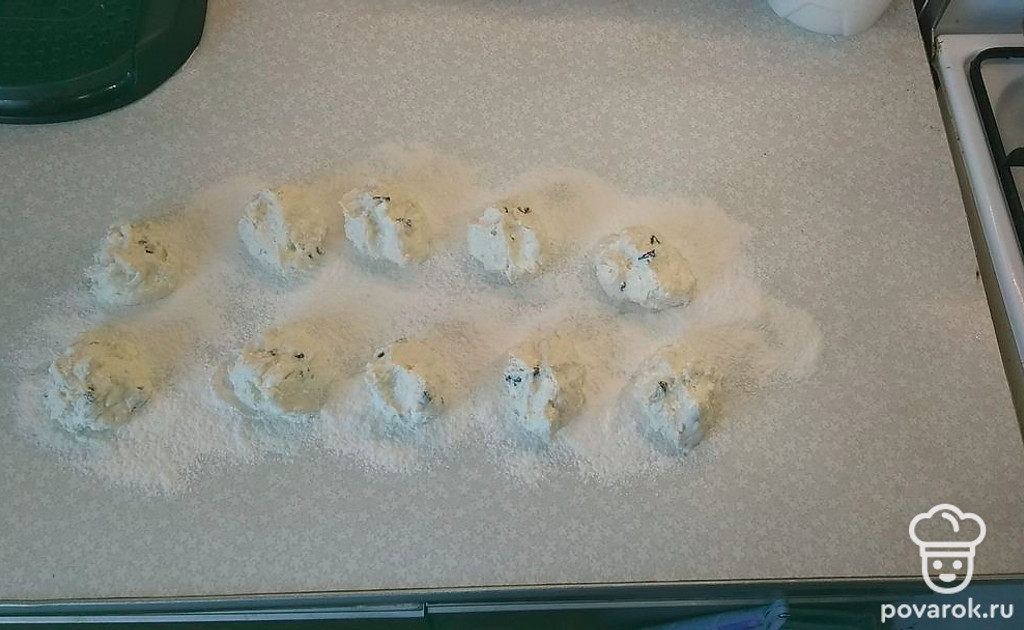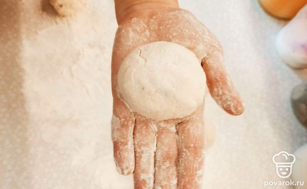 Запанируем в муке все шарики. С помощью ладошки придадим красивую форму.