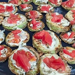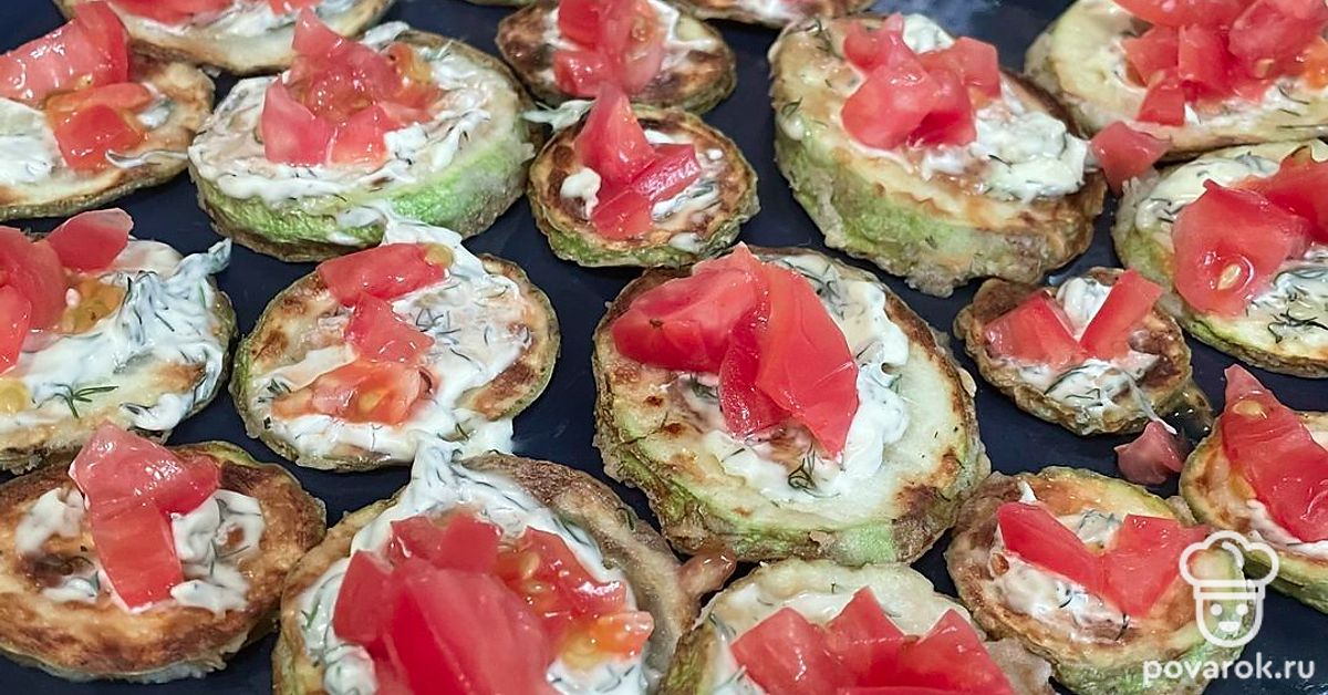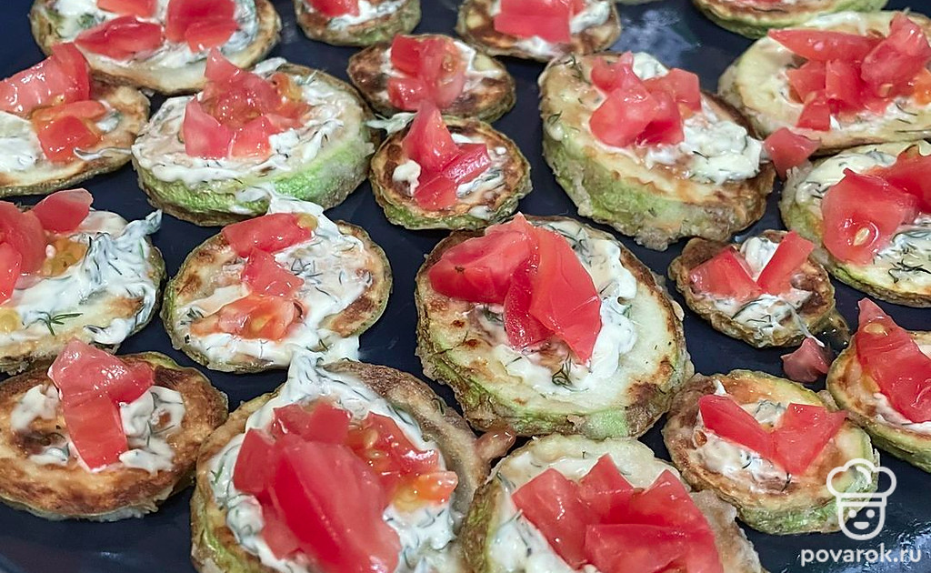 Смажьте майонезом кабачки. Помидор нарежьте кубиком и выложите сверху.