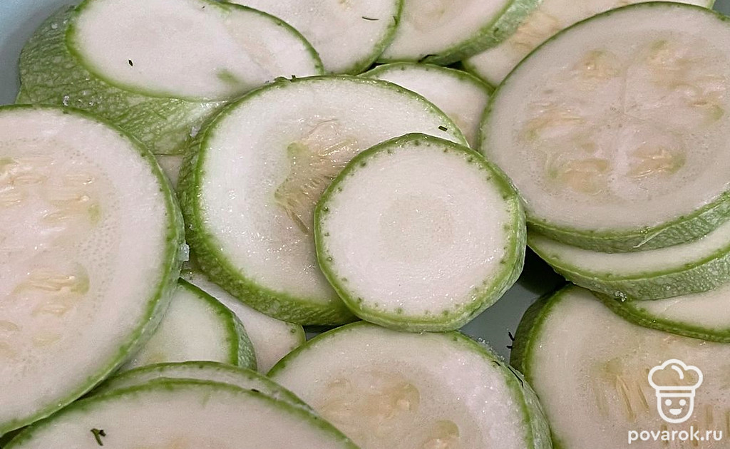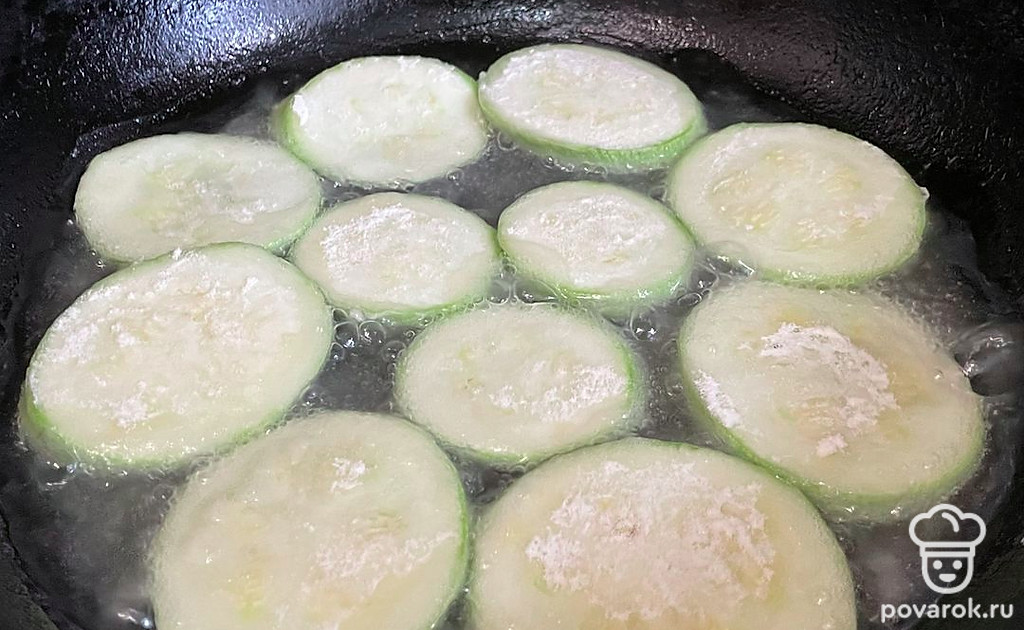 Кружки кабачка обваляйте в муке и обжарьте до румяности с двух сторон. Выложите кружки кабачка на салфетку, чтобы впиталось лишнее масло.