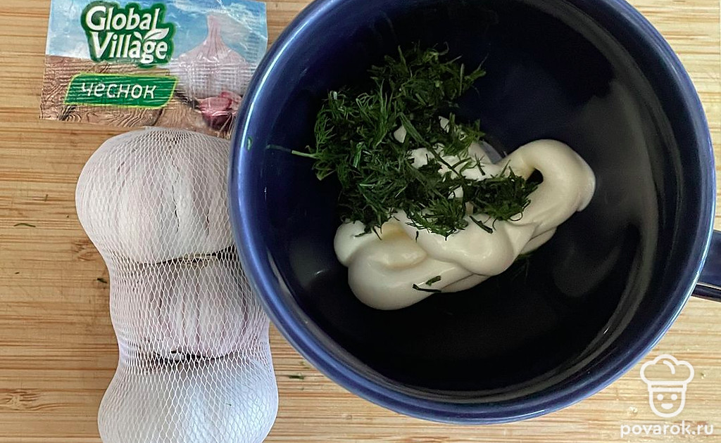 Смешайте майонез, укроп и натертый на терке зубчик чеснока.