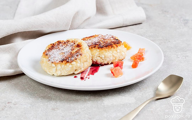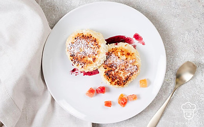 Перед подачей посыпьте сырники сахарной пудрой и полейте вареньем.