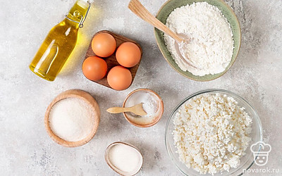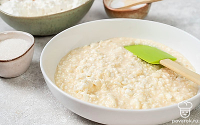 Всыпьте в небольшую емкость сахар, разбейте к нему яйца и перемешайте. В готовую смесь добавьте творог. Перемешайте ингредиенты с помощью венчика. Затем всыпьте соду, 4 ст.л. муки и ванилин. Снова перемешайте тесто до однородного состояния.