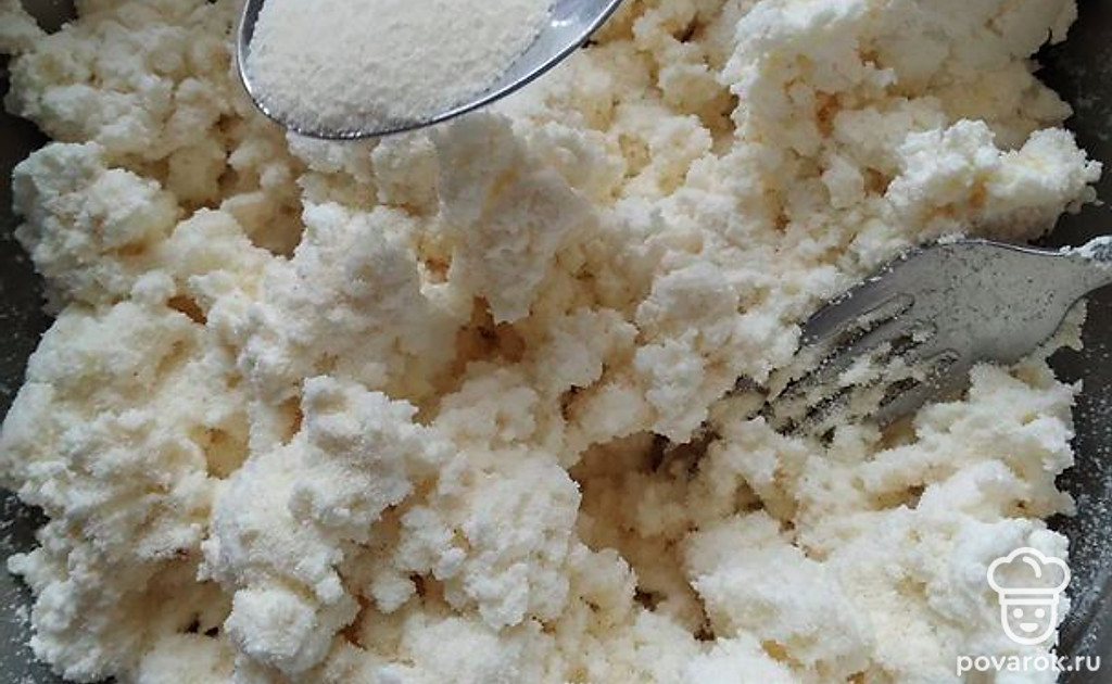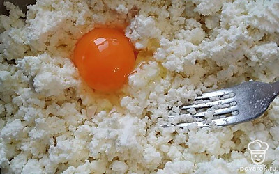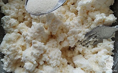 Добавляем соль, сахар, манную крупу. Все смешиваем, формируем сырники из творога. Обваливаем их в муке.