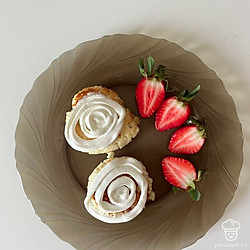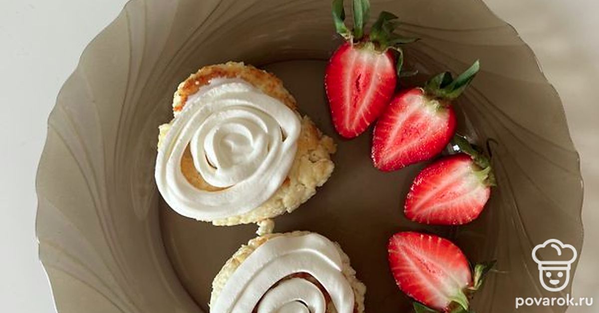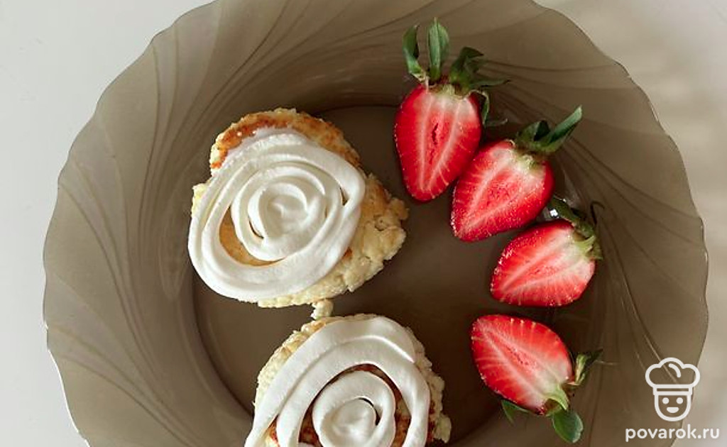 Перед подачей сырники можно украсить сметаной и клубникой.