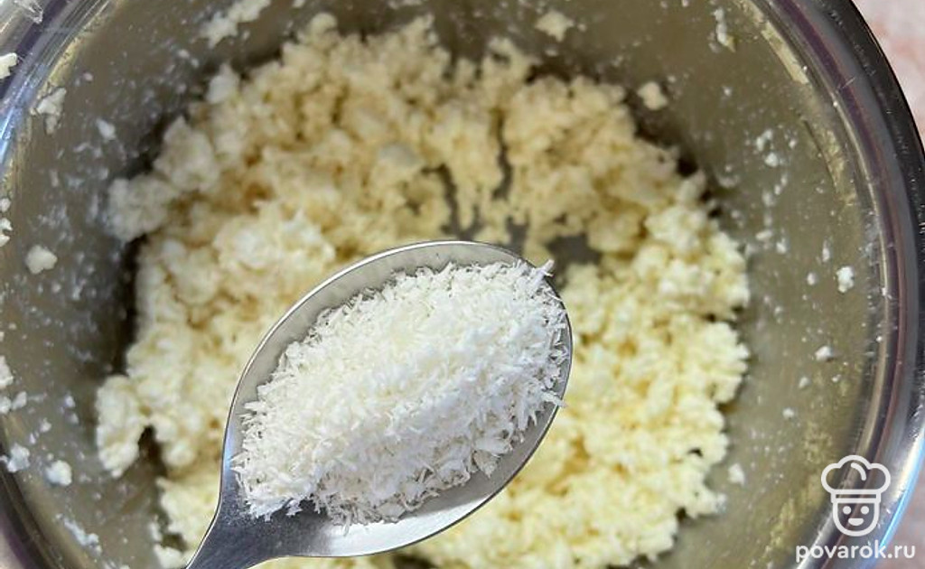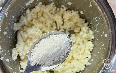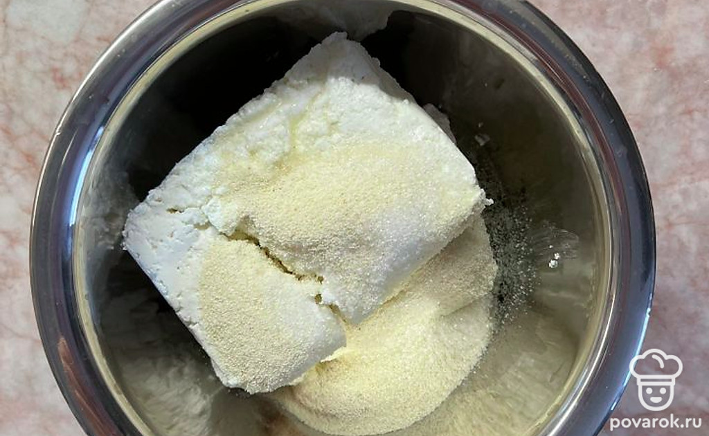 Добавить сахар, ванилин, манную крупу. Тщательно перемешать.