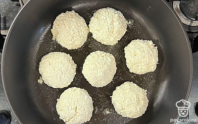 Сформировать сырники и выложить в разогретую сковороду. Жарить под крышкой на медленном огне 10 минут.