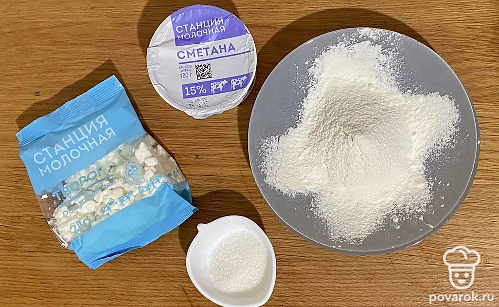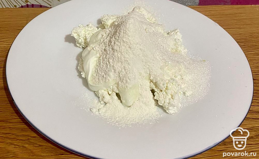 Далее добавляем к творогу со сметаной муку и сахар. Тщательно перемешиваем до состояния однородной массы.