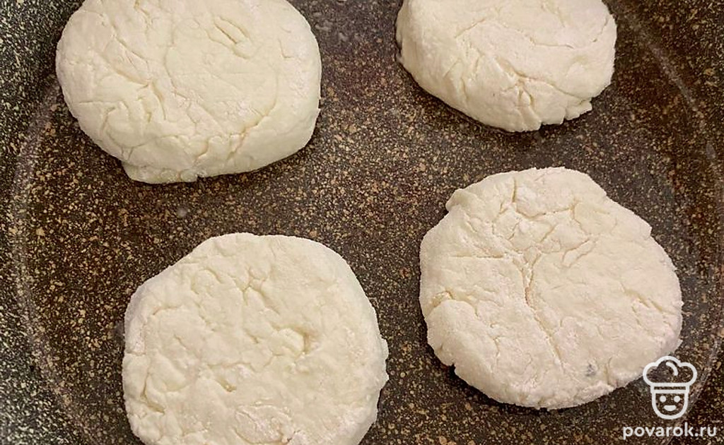 Формируем сырники и выкладываем их на предварительно смазанную подсолнечным маслом сковородку. Обжариваем с одной стороны до золотистой корочки в течение 4 минут на среднем огне.