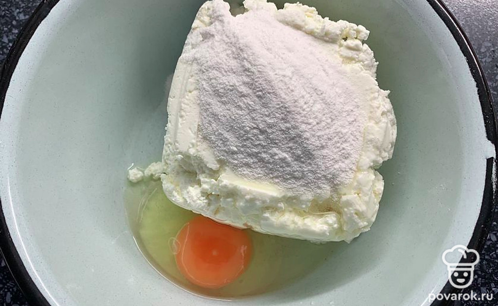 Соединить творог, рисовую муку, яйцо и соль.