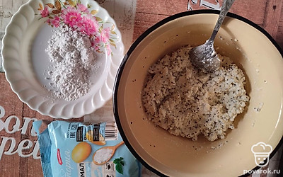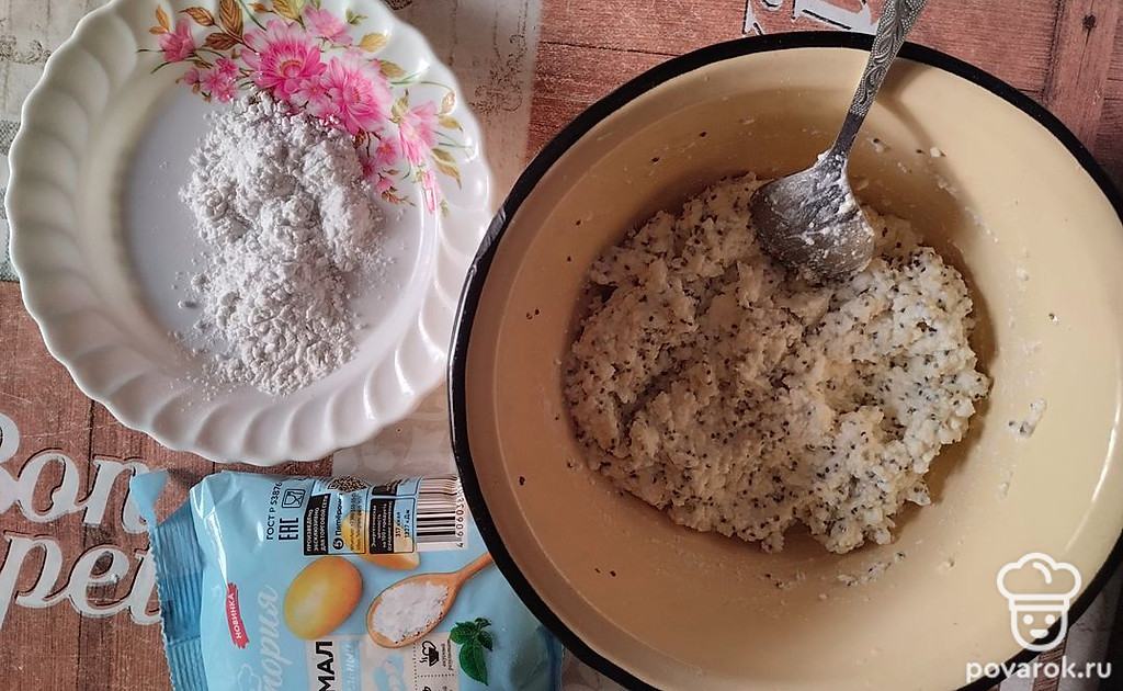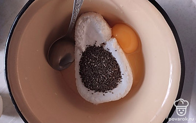 В творог добавляем яйцо и семена чиа. Перемешиваем, оставляем тесто хотя бы на полчаса.