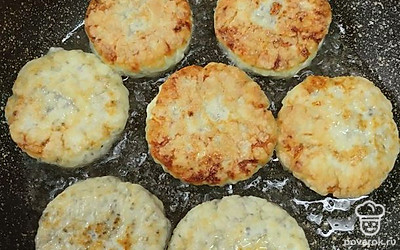 Формируем сырники. Окунаем их в крахмал и отправляем жариться на разогретую сковороду с небольшим количеством растительного масла.
