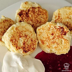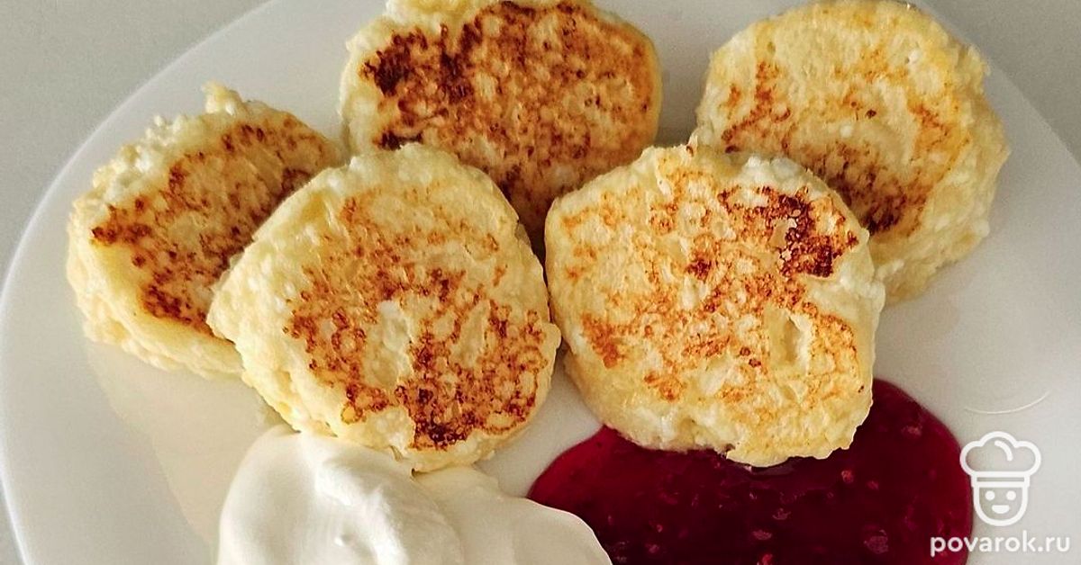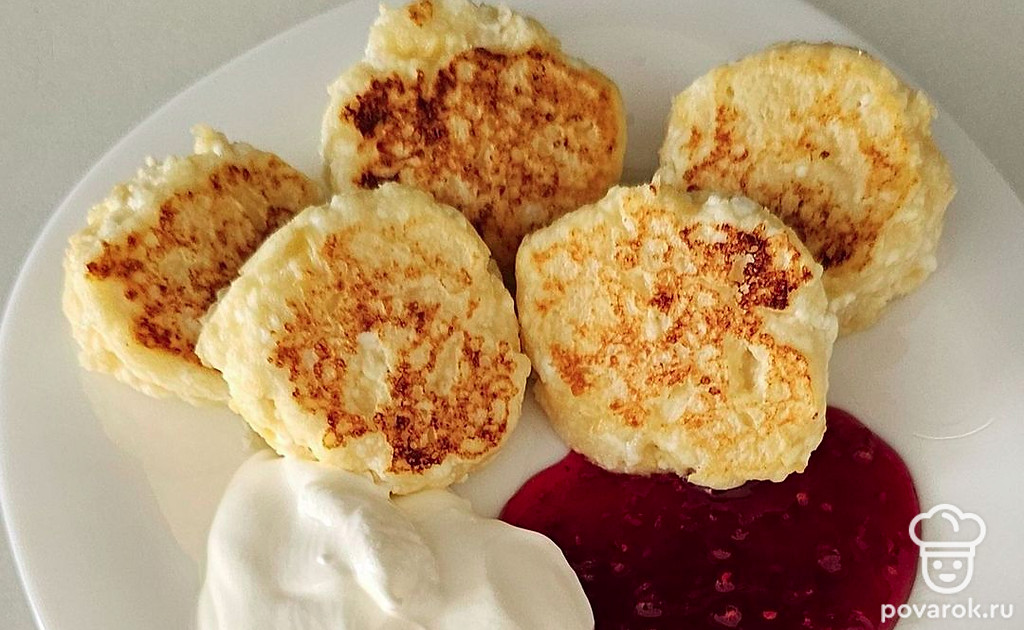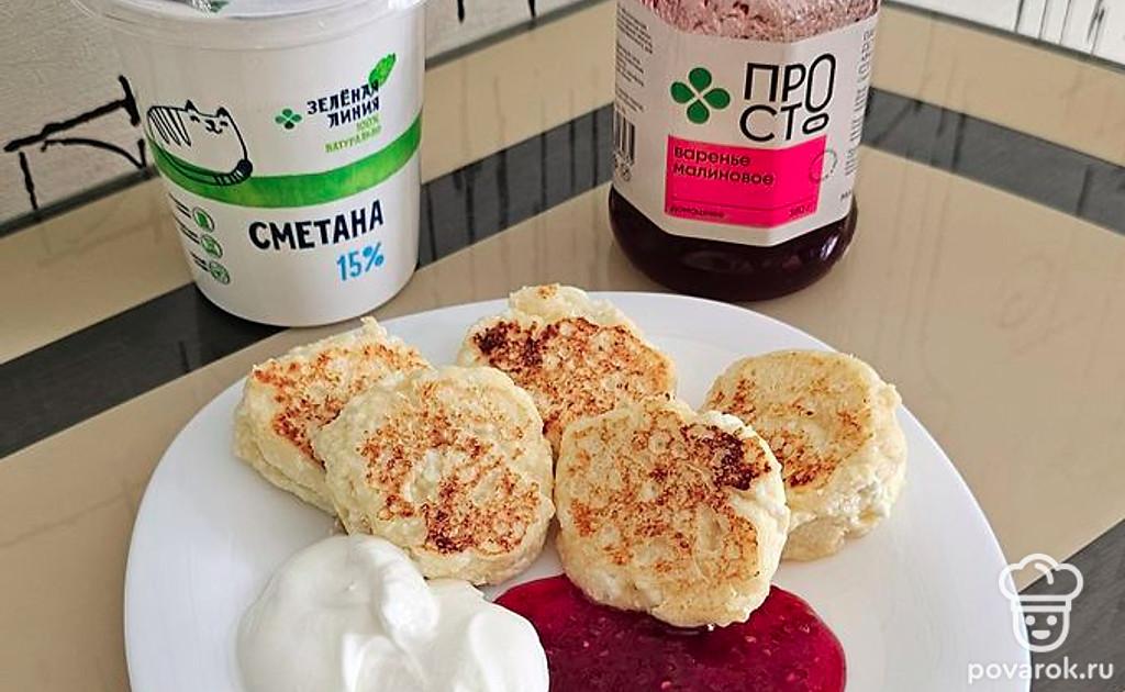 Выложите сырники на тарелку. Добавьте сметану и варенье.