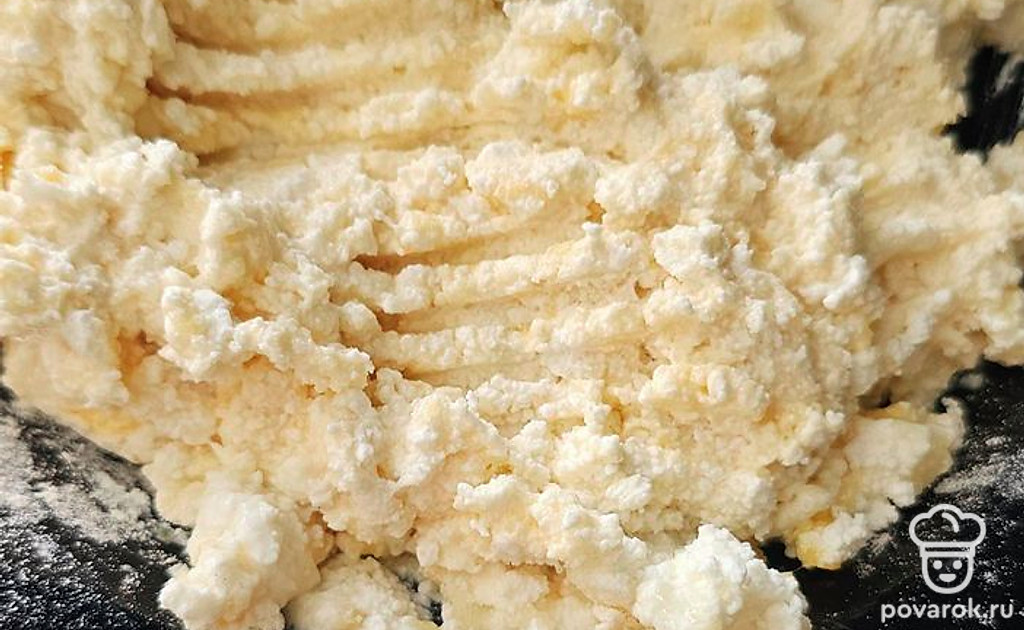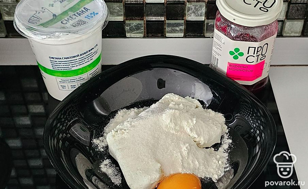 Творог, сахар, муку и яйцо соедините. Хорошо перемешайте.