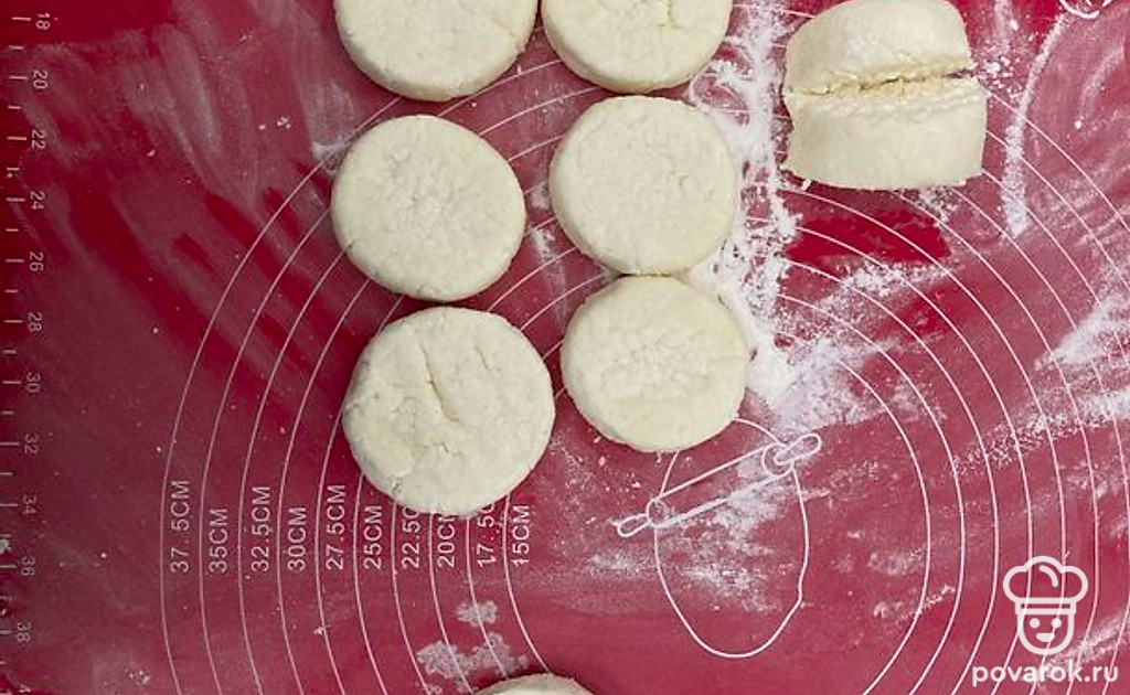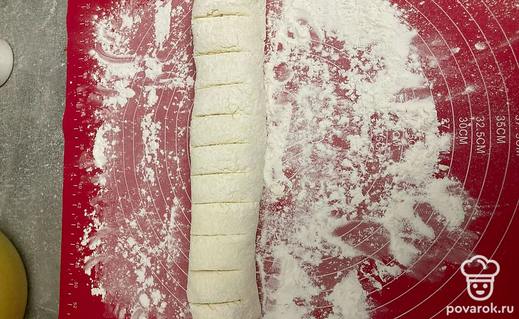 Рабочую поверхность посыпьте мукой. Из творожной массы сформируйте колбаску, разделите ее на 10-11 частей. Это зависит от того, какого диаметра сырники вы хотите.