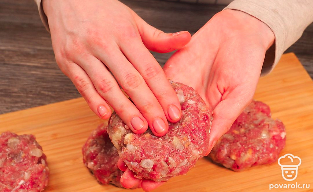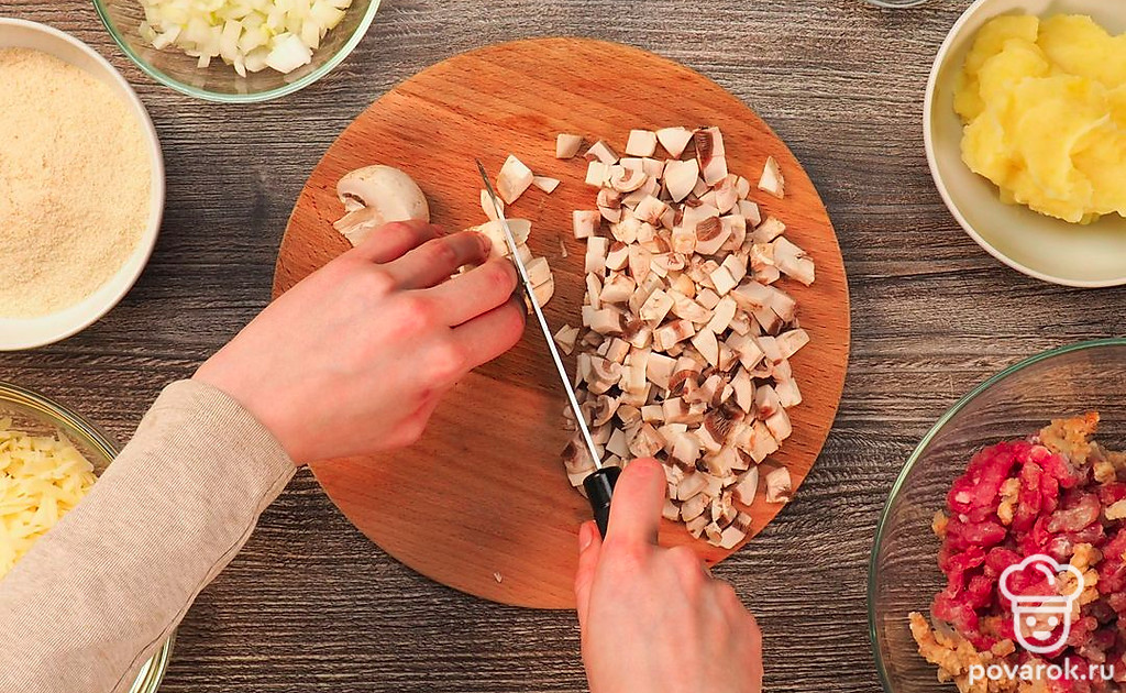 Сформируйте котлеты. Приправьте фарш солью и перцем, сформируйте небольшие лепешки. В центр каждой лепешки положите грибы и тертый сыр, слепите котлетку. Затем насыпьте панировочные сухари в глубокую миску и обваляйте котлету со всех сторон. Повторяйте процедуру до тех пор, пока не закончатся продукты.
