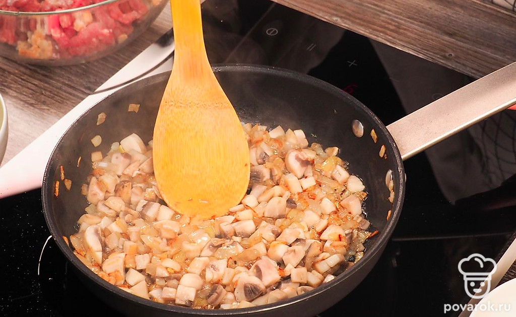 Обжарьте шампиньоны. Для этого поставьте на средний огонь сковороду, влейте растительное масло и добавьте лук. Обжарьте лук до золотистости и добавьте шампиньоны. Жарьте до испарения жидкости из шампиньонов. Ориентировочное время приготовления 7-10 минут.
